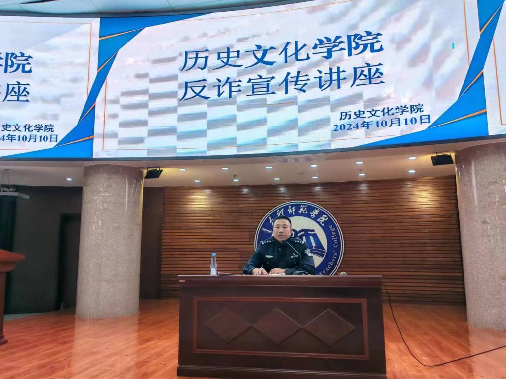 在当今互联网时代,手机、网络进入每家每户,互联网给我们带来便捷的同时,也伴生出电信网络诈骗新型违法犯罪。为有效预防各类诈骗犯罪活动,提高全体学生防范诈骗的意识,切实维护学生根本利益,10月11日下午,我院邀请自由路派出所田勇警官在博学楼学术报告厅开展了防诈骗知识宣传讲座。历史文化学院党总支副书记罗鹏、辅导员、保卫处邢大力老师以及2022-2024级历史文化学院全体本科生共同参加了此次活动。活动由党总支副书记罗鹏主持。