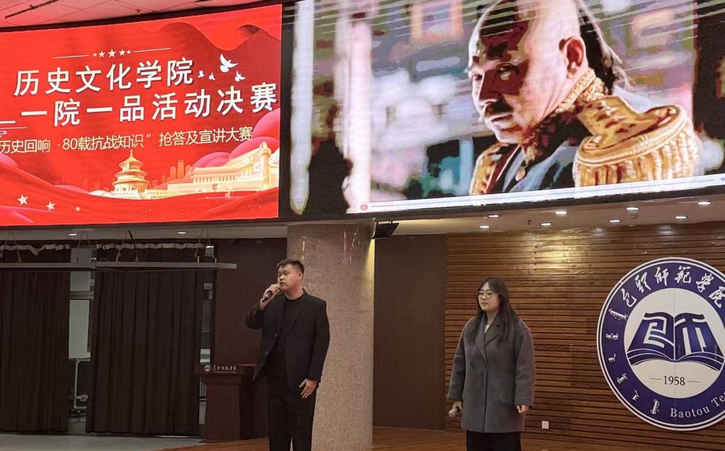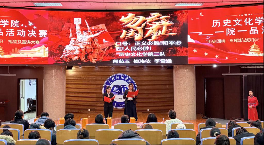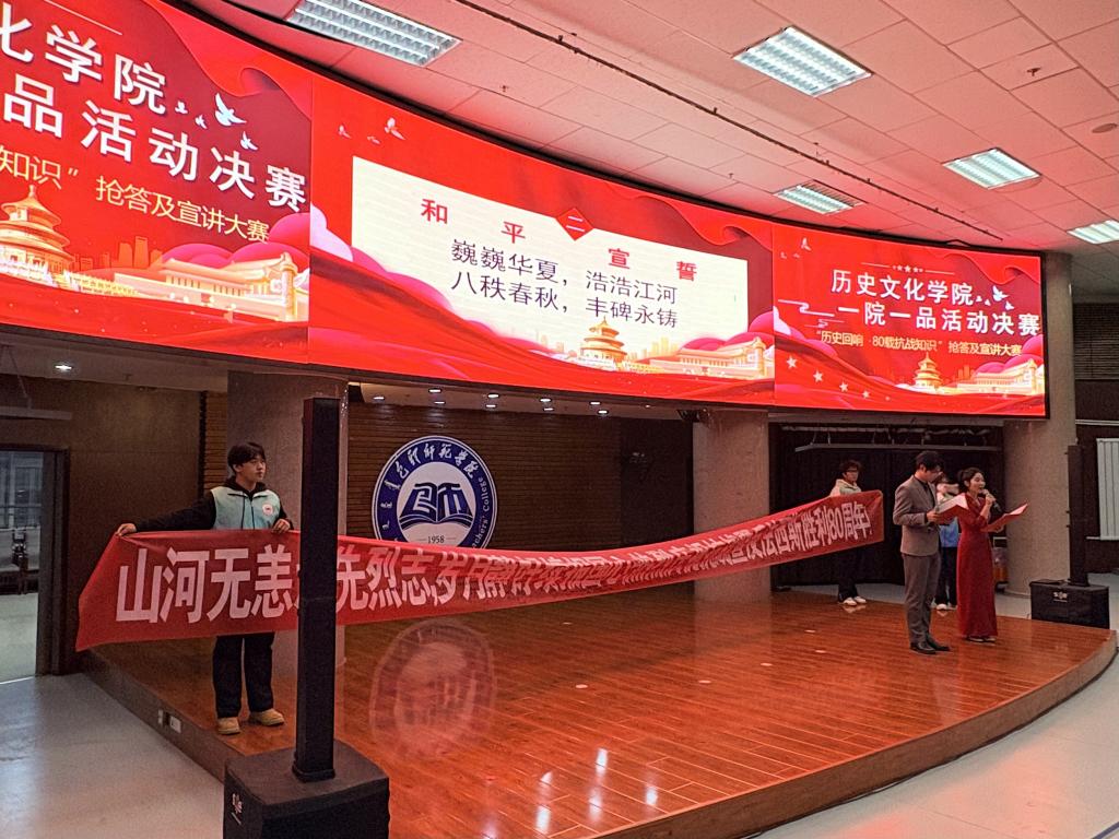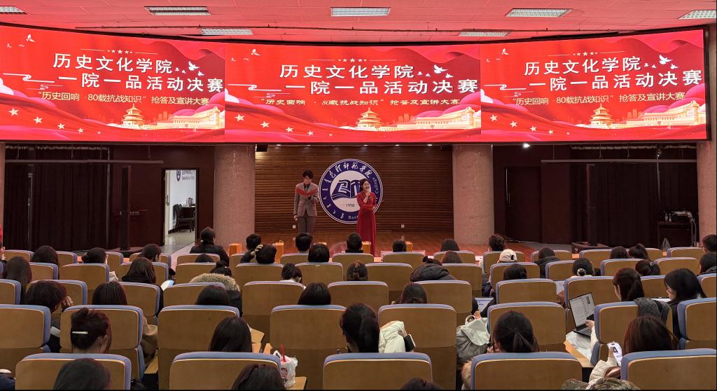 2025年11月20日晚,博学楼学术报告厅内气氛庄重而热烈,大屏幕上“1945-2025”的金色字样熠熠生辉,标志着历史文化学院“一院一品”特色活动——“历史回响·80载抗战知识”抢答及宣讲大赛决赛正式拉开帷幕。本次活动旨在纪念抗日战争胜利80周年,融专业实践与思政教育于一体,引导青年学子铭记历史、传承精神。院长胡琮禹、党总支副书记罗鹏、副院长张淑利、学工办包艳萍老师、王婷老师、历史学专业李思宇老师、王磊老师共同参加此次活动。