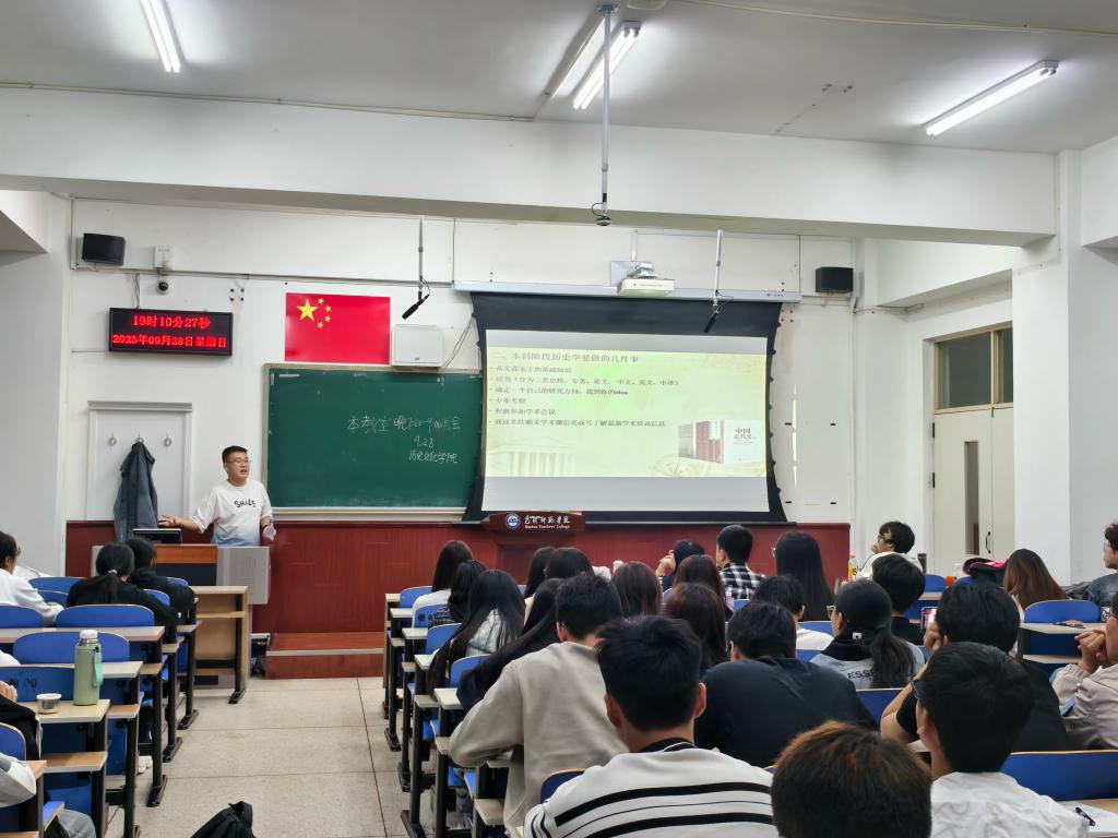 2025年9月28日,历史文化学院邀请2023届优秀本科毕业生杨皓然重返母校,为2025级新生带来了一场以“学业发展与个人成长”为主题的分享交流会。杨皓然结合自身本科阶段的专业学习与学生会工作经历,系统梳理了从本科到研究生的成长轨迹,并围绕如何平衡学业与学生工作、有效规划大学生活等话题,与在场同学展开深入交流。